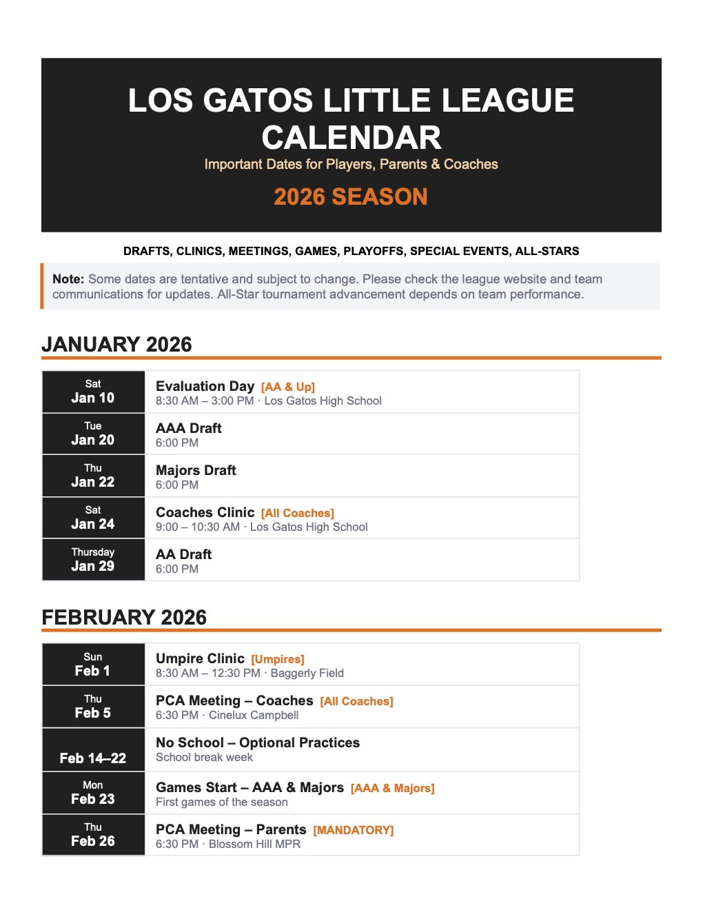 2026 LGLL Season Calendar
