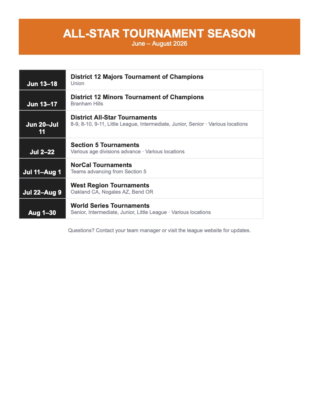 Click on the link above to view a printable document with key dates for the 2026 Season.
